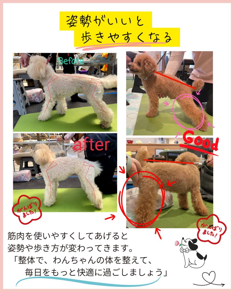 わんちゃんの立ち姿・歩き方をチェック!その子にあわせたたハンドケアによる施術で筋肉のコリ・ねじれをほくし動きやすい・歩きやすい体に整えていきます。お家で出来るケアアドバイスも行います。